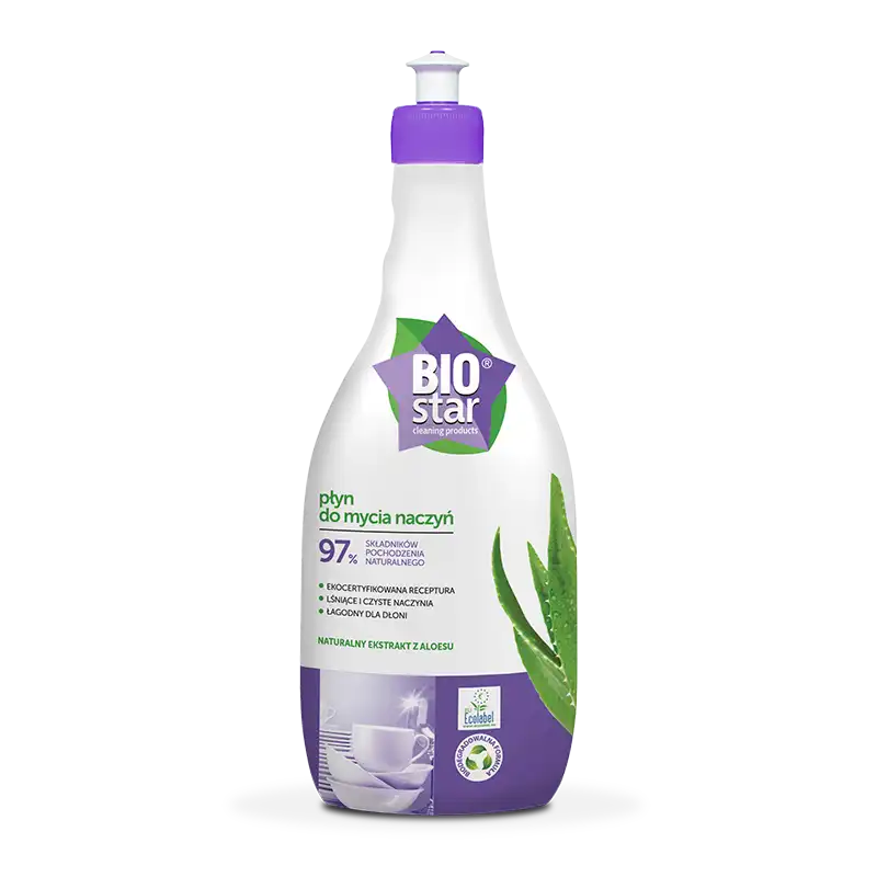 Ekologiczny płyn do mycia naczyń Biostar Cleaning Products z naturalnym ekstraktem z aloesu. Biodegradowalny, zawiera 97 % składników pochodzenia naturalnego. Skutecznie usuwa zabrudzenia, tłuszcz i przypalenia pozostawiając czyste i lśniące naczynia. Naturalny płyn do mycia naczyń jest łagodny dla dłoni, zawiera glicerynę.