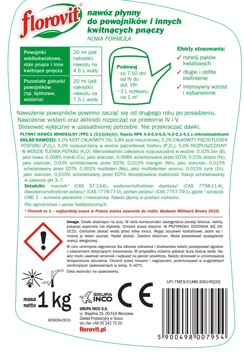 Florovit do powojników i innych kwitnących pnączy przeznaczony jest do doglebowego dokarmiania powojników (clematis), wiciokrzewów (lonicera), glicynii (wisteria) i innych kwitnących pnączy. Regularne stosowanie nawozu wpływa na długie i obfite kwitnienie oraz intensywny wzrost i wybarwienie roślin.