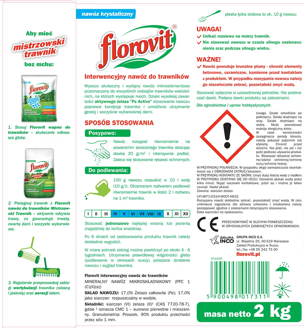 Nawożenie posypowe – nawóz rozsypać równomiernie na powierzchni skoszonego trawnika stosując dawkę 20g/m2 i intensywnie podlać. Zaleca się stosowanie rękawic ochronnych.