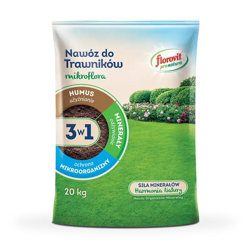 Florovit Mikroflora 3w1 nawóz do trawników zawiera naturalne substancje organiczne poprawiające jakość gleby (zwiększa żyzność) oraz substancje mineralne niezbędne dla prawidłowego wzrostu i rozwoju roślin. Nawóz zawiera związki próchnicze wykazujące duże podobieństwo do próchnicy zawartej w kompoście czy oborniku. Systematyczne stosowanie Florovit Mikroflora 3w1 do trawników w naturalny sposób odbudowuje właściwą strukturę podłoża. Nawóz może być bezpiecznie stosowany na wszystkich rodzajach gleb. Substancje humusowe przyczyniają się do lepszego wzrostu i rozwoju korzeni oraz skutecznego pobierania z gleby substancji pokarmowych.