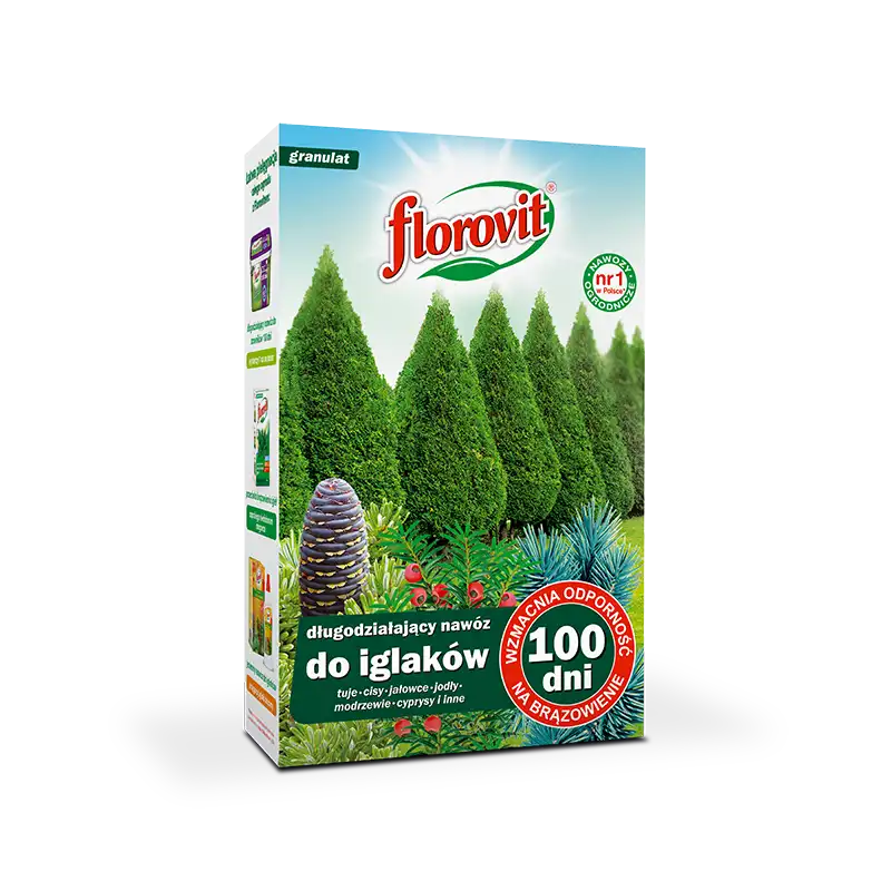 Florovit Nawóz długodziałający do iglaków to wysokiej jakości kompleksowy nawóz długodziałający przeznaczony do wszystkich rodzajów roślin iglastych. Przeznaczony zarówno pod nowe nasadzenia, jak i pod rośliny wieloletnie. Zapewnia bujny wzrost oraz gęste i pięknie wybarwione igły.