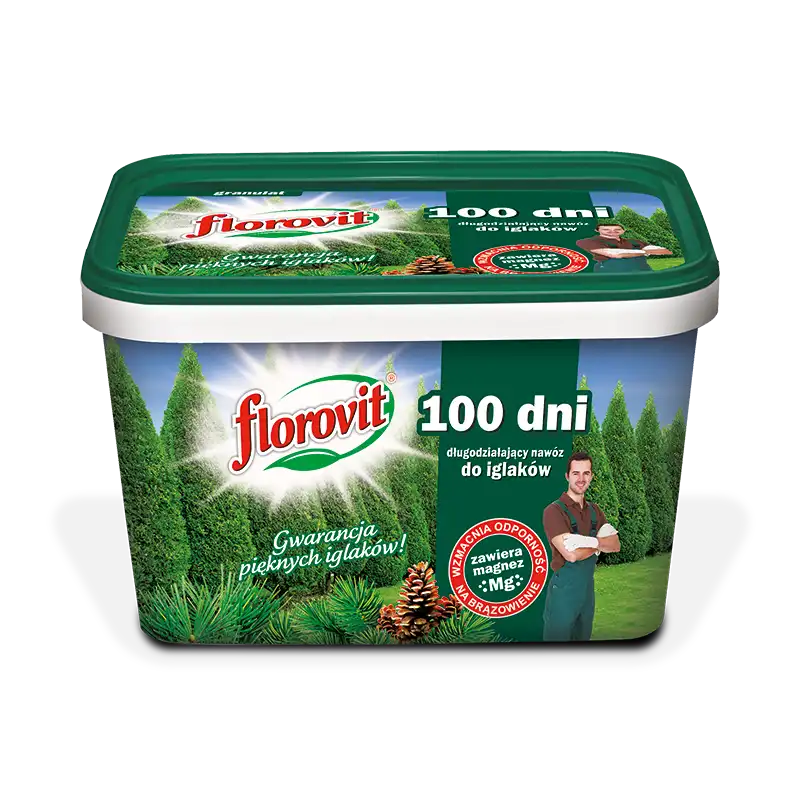 Florovit Nawóz długodziałający do iglaków to wysokiej jakości kompleksowy nawóz długodziałający przeznaczony do wszystkich rodzajów roślin iglastych. Przeznaczony zarówno pod nowe nasadzenia, jak i pod rośliny wieloletnie. Zapewnia bujny wzrost oraz gęste i pięknie wybarwione igły.