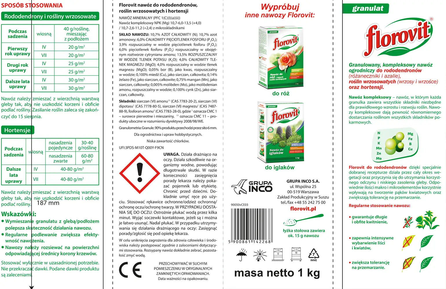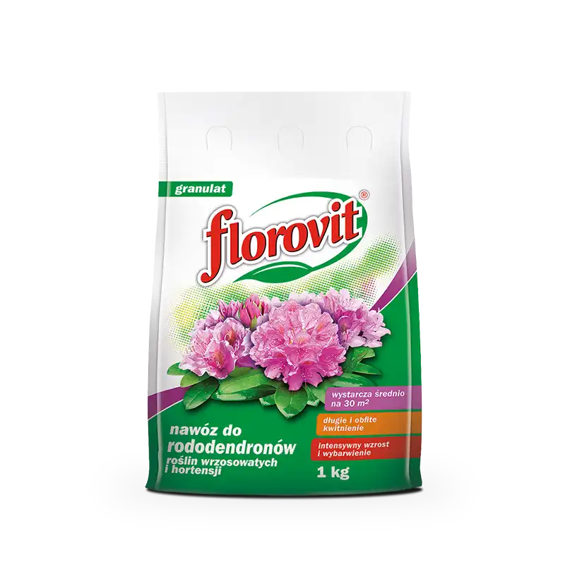 Florovit nawóz do rododendronów, roślin wrzosowatych i hortensji, przeznaczony jest do posypowego nawożenia rododendronów (różaneczniki i azalie) oraz roślin wrzosowatych. Skład nawozu jest odpowiednio dobrany do potrzeb pokarmowych wszystkich gatunków rododendronów oraz roślin wrzosowatych, zapewniając równomierny zdrowy wzrost, obfite kwitnienie oraz intensywne wybarwienie kwiatów. Wysoka zawartość potasu zwiększa odporność na wymarzanie oraz wpływa na ogólny wygląd roślin.