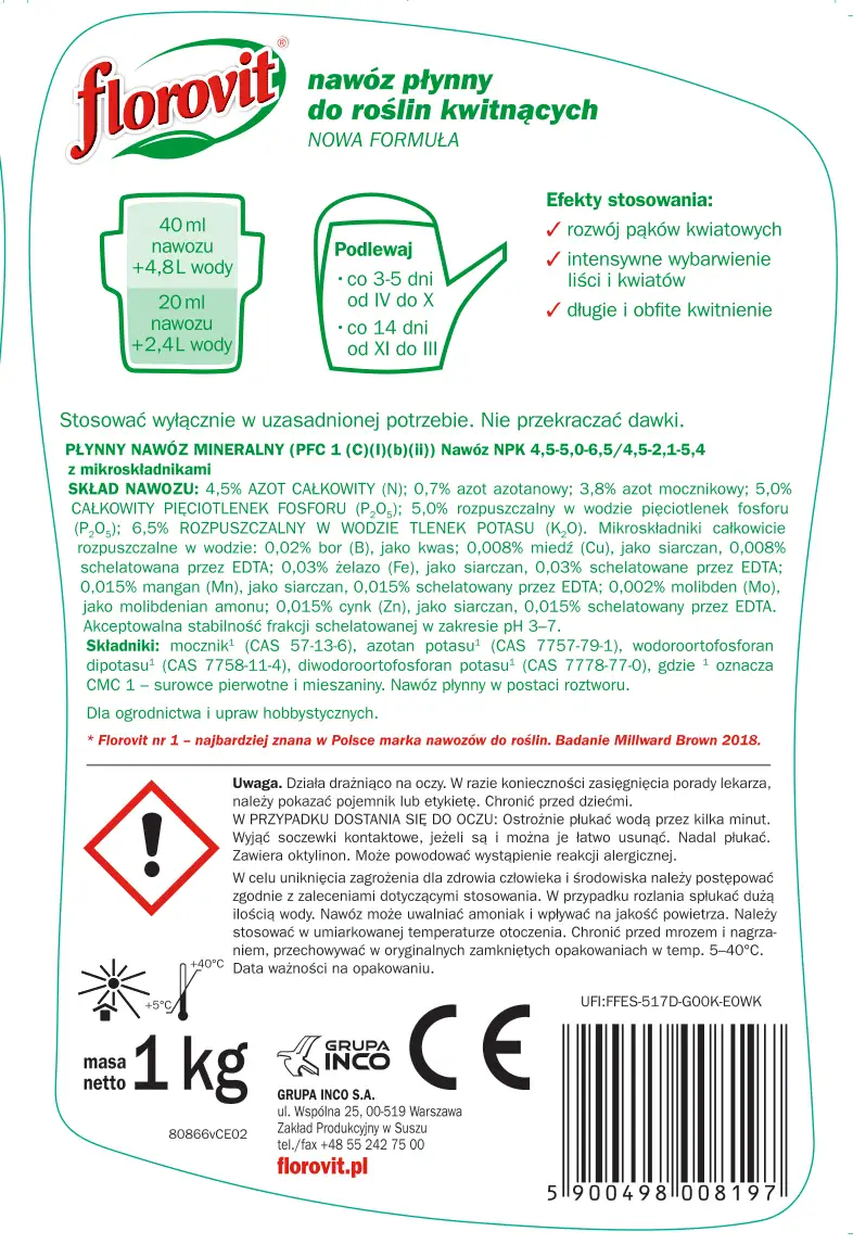 Florovit Nawóz do roślin kwitnących przeznaczony jest do dokarmiania roślin kwitnących.