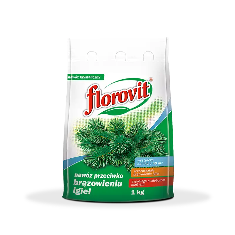 Najczęstszą przyczyną obumierania drzew iglastych jest niedobór składników pokarmowych. Po pewnym czasie od posadzenia następuje zmiana koloru igieł do jasnozielonego, następnie żółtego, w końcu igły brunatnieją i opadają a drzewo obumiera. Opisane objawy nie są spowodowane przez szkodniki. Są to skutki niewłaściwego zaopatrzenia w składniki pokarmowe - najczęściej występuje niedobór magnezu. Ponieważ przyswajalność składników z gleby zmniejsza się bardzo w glebie suchej, opisane objawy niedoboru najczęściej widoczne są w okresach suszy. Florovit przeciwko brązowieniu zapobiega brązowieniu igieł i przeciwdziała niedoborom magnezu.