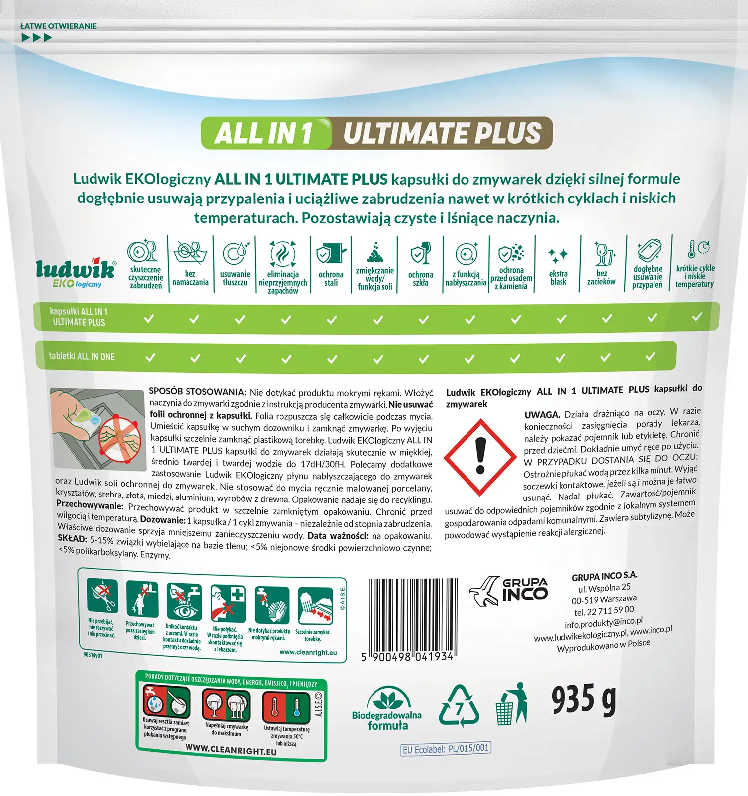 Sposób stosowania: Nie dotykać produktu mokrymi rękami. Włożyć naczynia do zmywarki zgodnie z instrukcją producenta zmywarki. Nie usuwać folii ochronnej z kapsułki. Folia rozpuszcza się całkowicie podczas mycia. Umieścić kapsułkę w suchym dozowniku i zamknąć zmywarkę. Po wyjęciu kapsułki szczelnie zamknąć plastikową torebkę. Ludwik Ekologiczny ALL IN 1 ULTIMATE PLUS kapsułki do zmywarek działają skutecznie w miękkiej, średnio twardej i twardej wodzie do 17 dH/30 fH. Polecamy dodatkowe zastosowanie Ludwik płynu nabłyszczającego do zmywarek oraz Ludwik soli ochronnej do zmywarek. Nie stosować do mycia ręcznie malowanej porcelany, kryształów, srebra, złota, miedzi, aluminium, wyrobów z drewna. Opakowanie nadaje się do recyclingu.