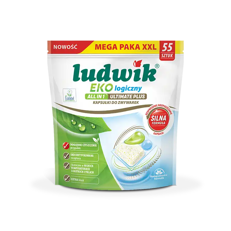 Ludwik Ekologiczny ALL IN 1 ULTIMATE PLUS kapsułki do zmywarek dzięki silnej formule dogłębnie usuwają przypalenia i uciążliwe zabrudzenia nawet w krótkich cyklach i niskich temperaturach. Pozostawiają czyste i lśniące naczynia.