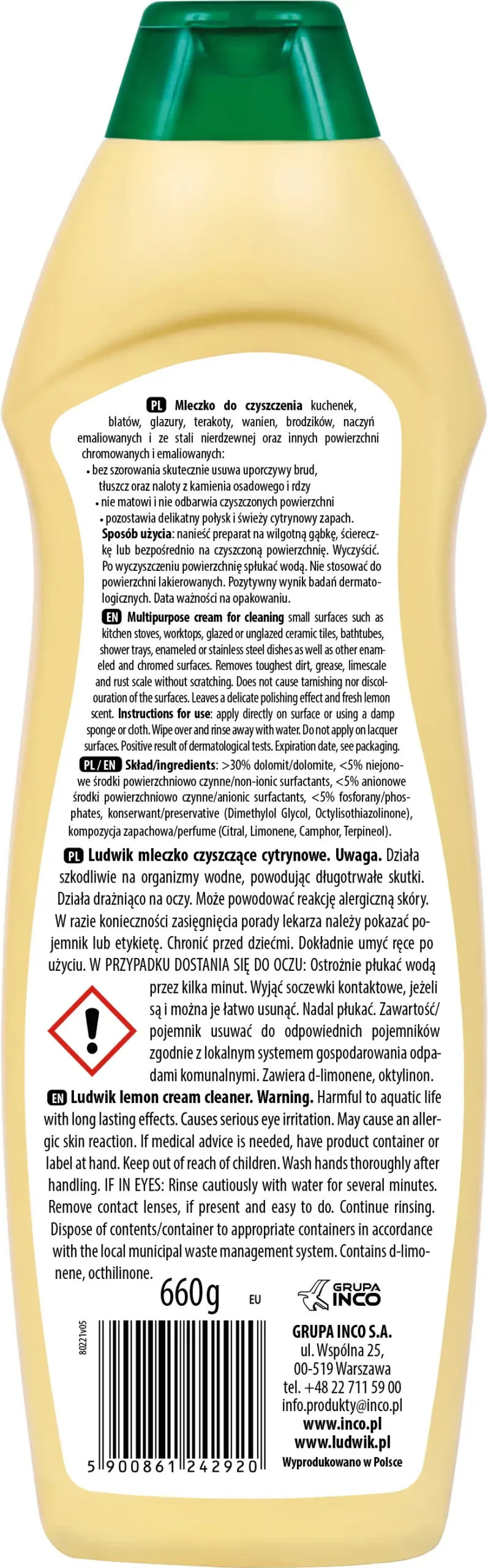 Ludwik mleczko czyszczące cytrynowe 660 g do czyszczenia kuchenek, blatów, glazury, terakoty, wanien, brodzików, naczyń emaliowanych i ze stali nierdzewnej oraz innych powierzchni chromowanych i emaliowanych:
