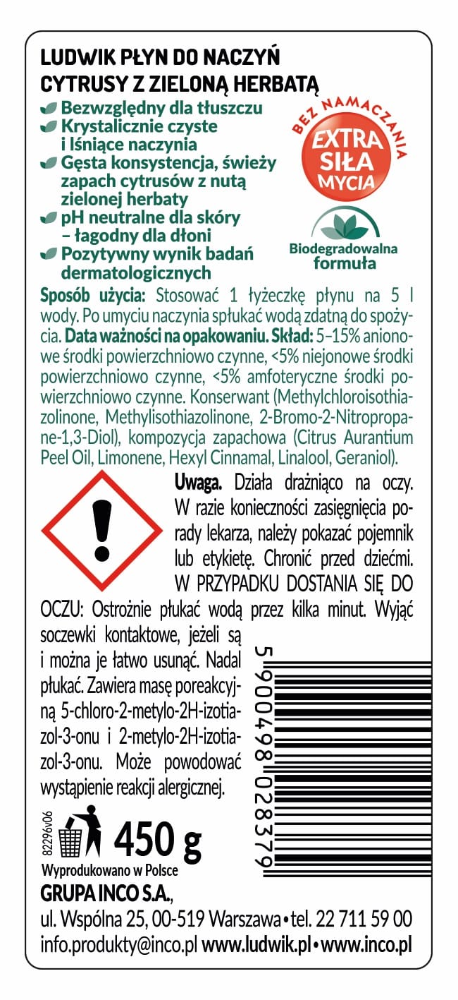 Data ważności Ludwik do naczyń cytrusy z zieloną herbatą Duet Świeżości na opakowaniu.