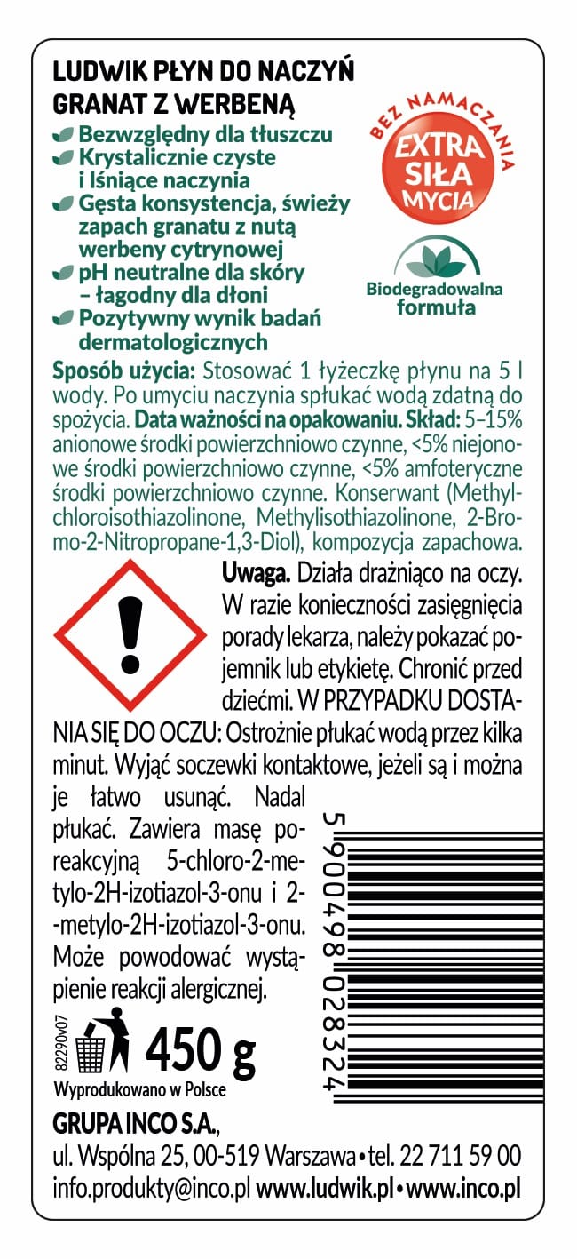Ludwik płyn do naczyń granat z werbeną Duet Świeżości wydajny płyn o wzmocnionej sile mycia i gęstej konsystencji. Zapewnia krystalicznie czyste i lśniące naczynia. Posiada także biodegradowalną formułę i jest bezwzględny dla tłuszczu.