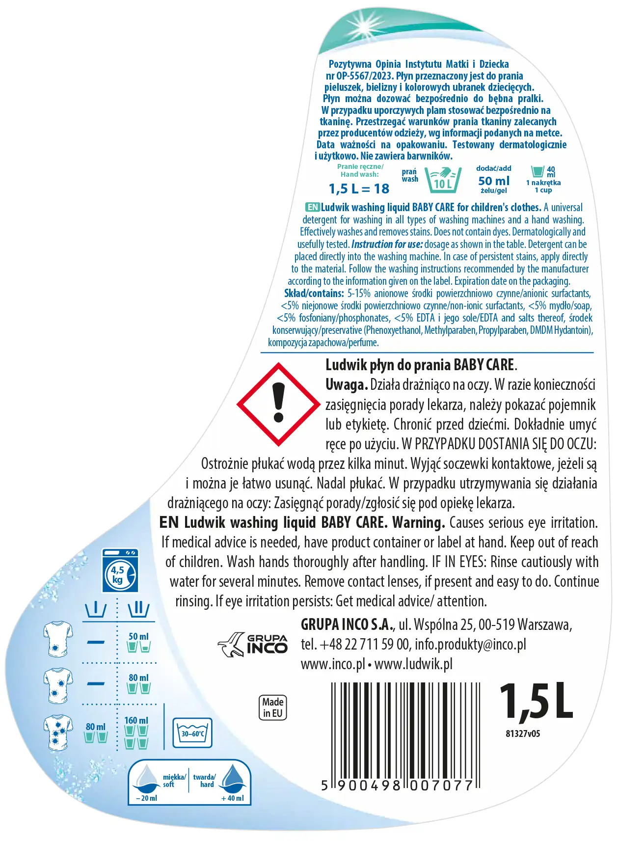 Ludwik Baby Care do prania ubranek dziecięcych to delikatny płyn, który można stosować w każdej pralce. Sprawdzi się również w praniu ręcznym. Posiada pozytywną opinię Instytutu Matki i Dziecka.