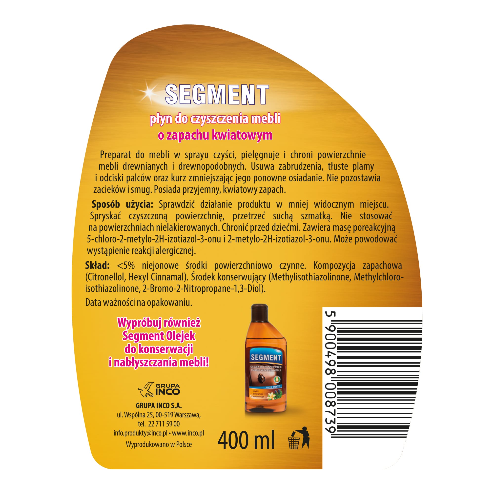 Segment spray do czyszczenia mebli o zapachu kwiatowym Preparat do mebli w sprayu czyści, pielęgnuje i chroni powierzchnie mebli drewnianych i drewnopodobnych. Usuwa zabrudzenia, tłuste plamy i odciski palców oraz kurz zmniejszając jego ponowne osiadanie. Nie pozostawia zacieków i smug. Posiada przyjemny, kwiatowy zapach.